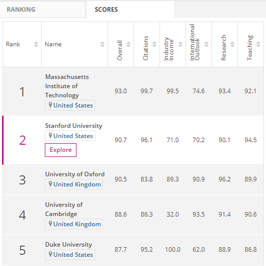 THE(The Times Higher Education)发布的2019世界大学商科与经济排名中,麻省理工学院位居今年世界大学商科与经济排名第1, 榜单第2为斯坦福大学, 榜单第3为牛津大学。以下为今年世界大学商科与经济排名10强: