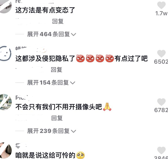 女生说到,你们安摄像头都在前面,只看到上半身,可我的班主任竟然要求再安一个摄像头,还要安在头顶上,能照到全身,上网课期间全程都要开着,不管你干什么,老师都能看见。