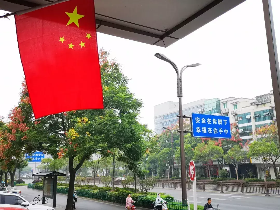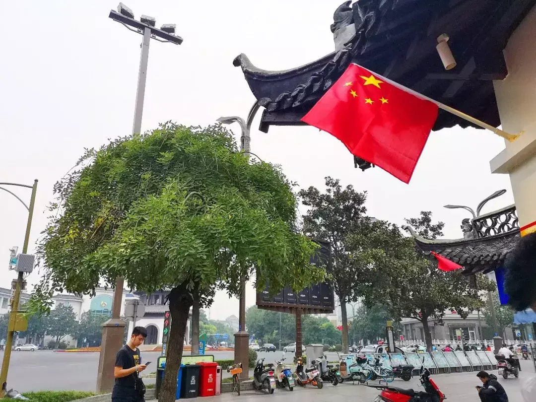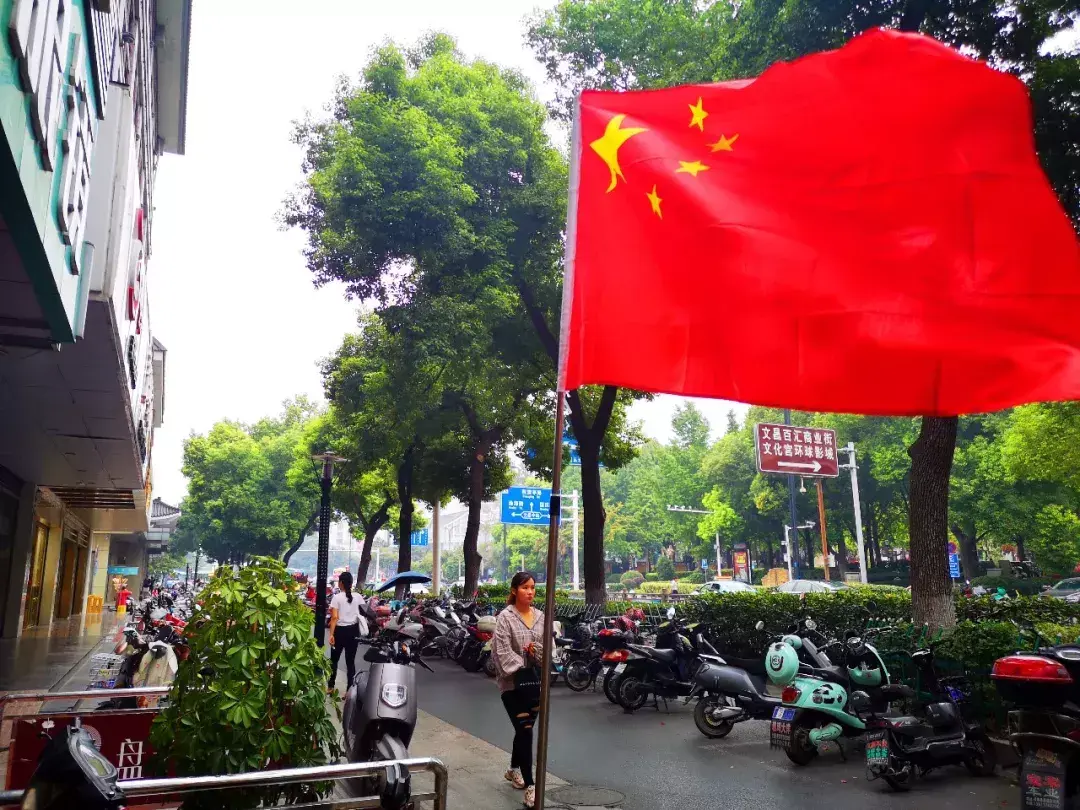 (五星红旗插满扬城大街小巷。 孔棋 摄)
