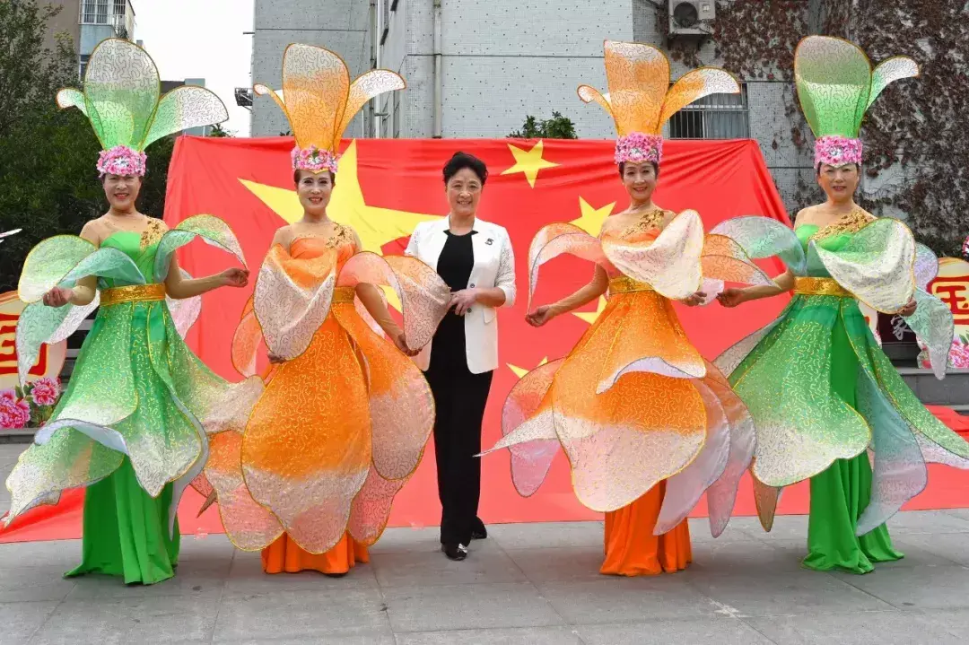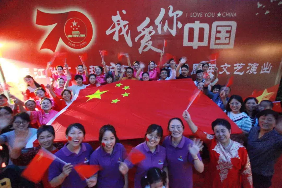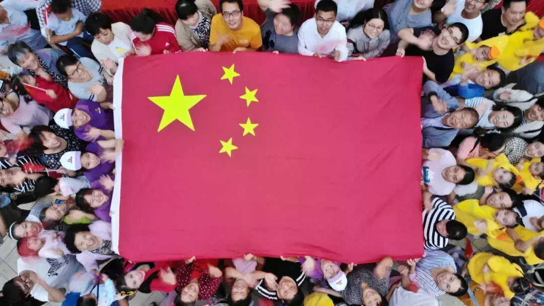 (扬州市春江社区开展“我爱你中国”活动,社区的居民通过与国旗合影、歌唱祖国等形式多样的活动,来表达对祖国的热爱和对国旗的敬仰,庆祝新中国成立70周年。孟德龙 摄)