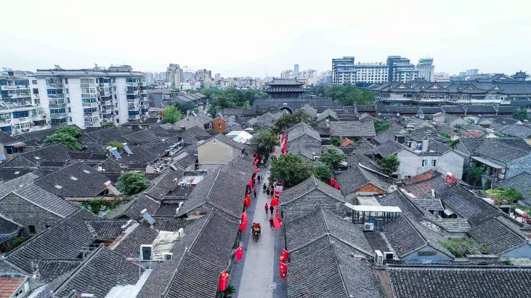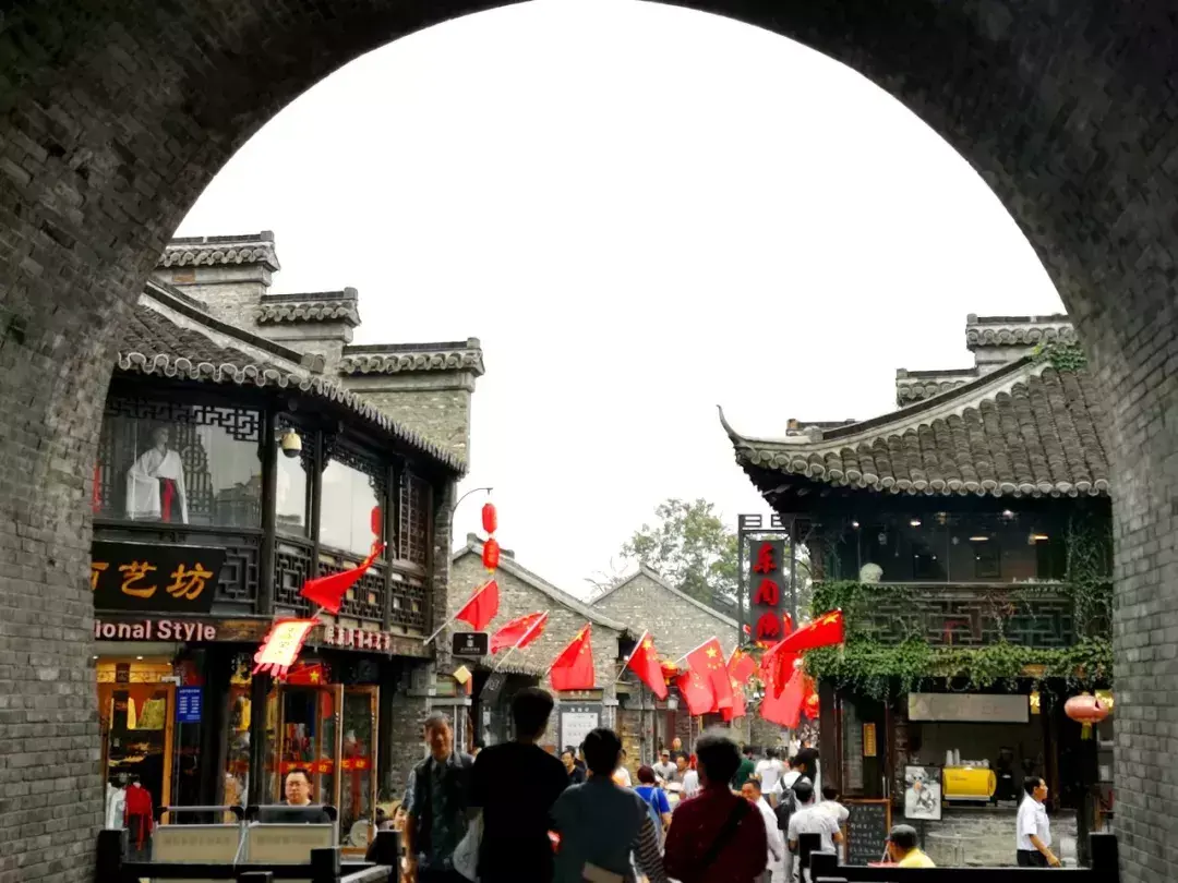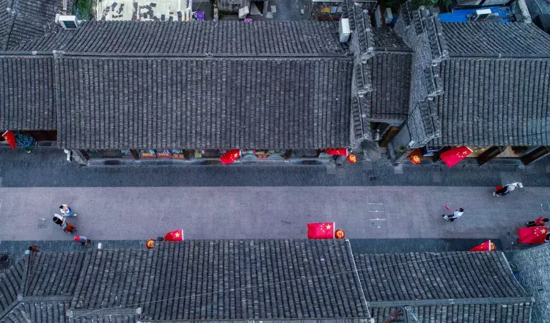 (东关街商家门前插上了鲜艳的五星红旗,游人徜徉在“中国红”里流连忘返。刘江瑞 孔棋 摄)