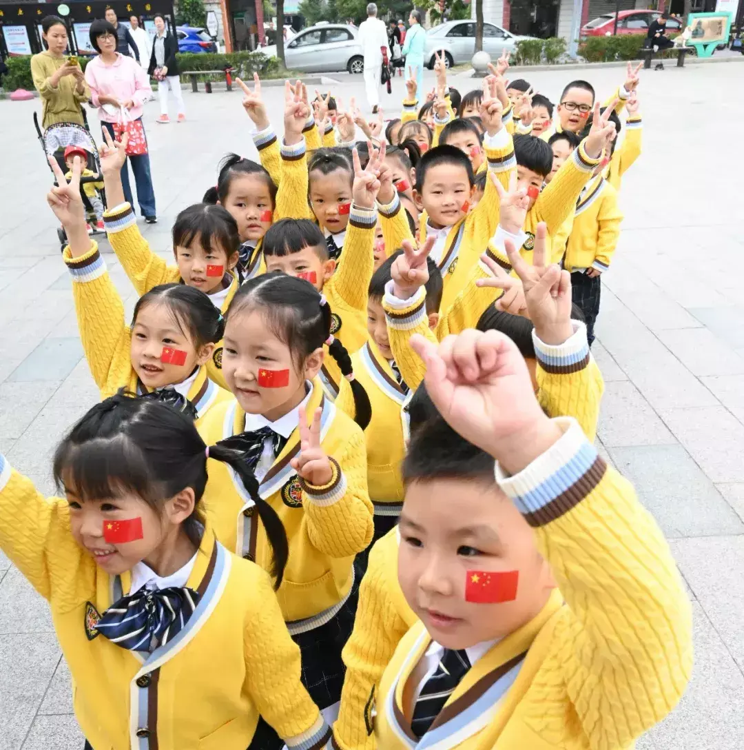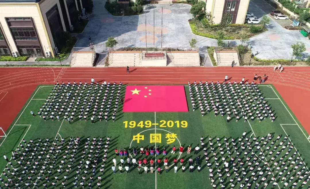 (扬州市邗江美琪学校开展“祝福祖国迎国庆”主题教育活动,小学生用快闪唱响歌曲《我和我的祖国》,表达自己的爱国情怀和对伟大祖国的衷心祝福,庆祝新中国成立70周年。 孟德龙 摄)