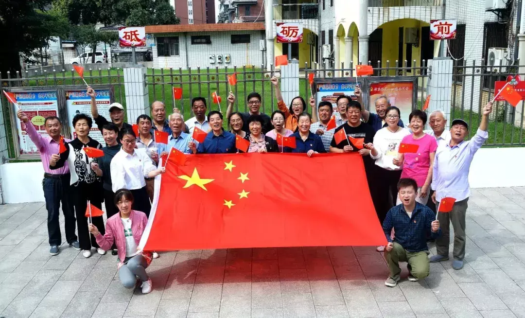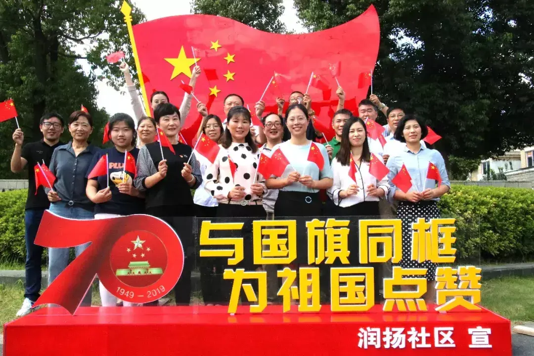 (润扬社区在辖区的显著位置设置了国旗展牌,给居民提供和国旗同框与国旗合影的环境气氛,向新中国成立70周年献礼。肖静 经露 宋永根 摄)