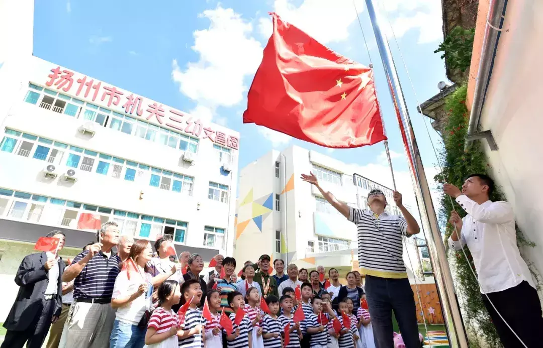 (邗江区双桥社区党总支组织社区党员干部、退役老兵、侨眷、少数民族居民,联合辖区幼儿园小朋友共同开展以“我爱祖国、同唱国歌”为主题的党日活动。 庄文斌 张云 石伟健 宋永根 摄)