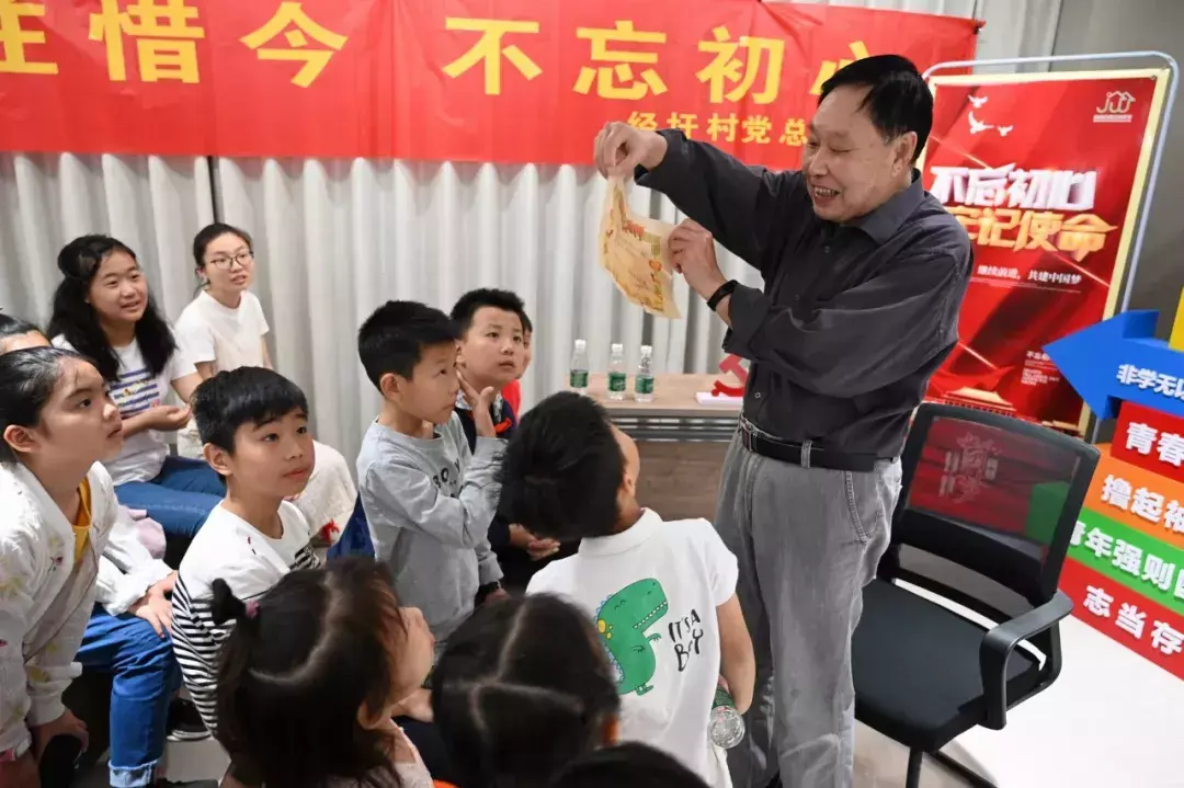 (在西湖镇党群邻里服务中心,老党员张永延向青少年们讲述自己的入党初心和亲身经历,并带了自己的老照片、老物件与在座的青少年分享。宋永根 张浩 田雨 摄)