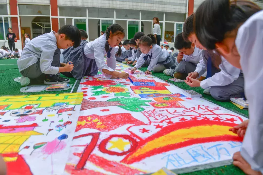 (扬州市汶河幼儿园的百名小朋友在摆成“70”字样的百米长卷上手绘心中蓝图,共同为新中国成立70周年庆生。刘江瑞 摄)