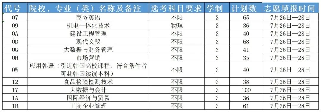 开设建设工程管理、机电一体化技术、食品检验检测技术、大数据与财务管理、大数据与会计、国际经济与贸易、工商企业管理、市场营销、商务英语、应用韩语、现代文秘共11个专科专业。