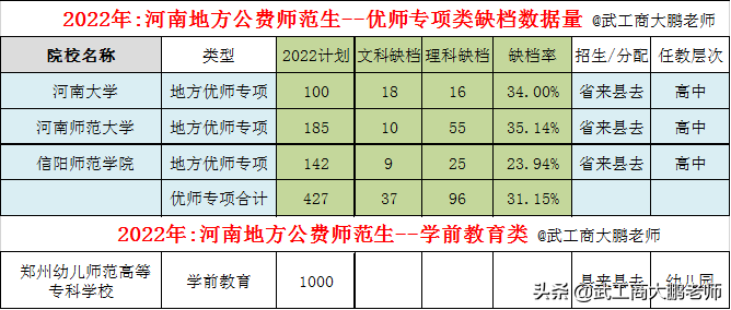 2022年:河南地方公费师范生--优师专项类缺档数据量
