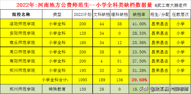 2022年:河南地方公费师范生--小学全科类缺档数据量