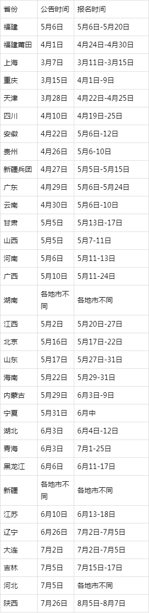 至于2020年的具体时间,要依据2020年的为准。发布公告、报名、笔试的时间,前后时间差大致为7天。