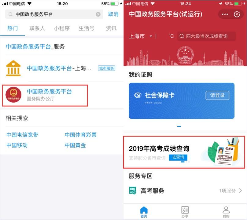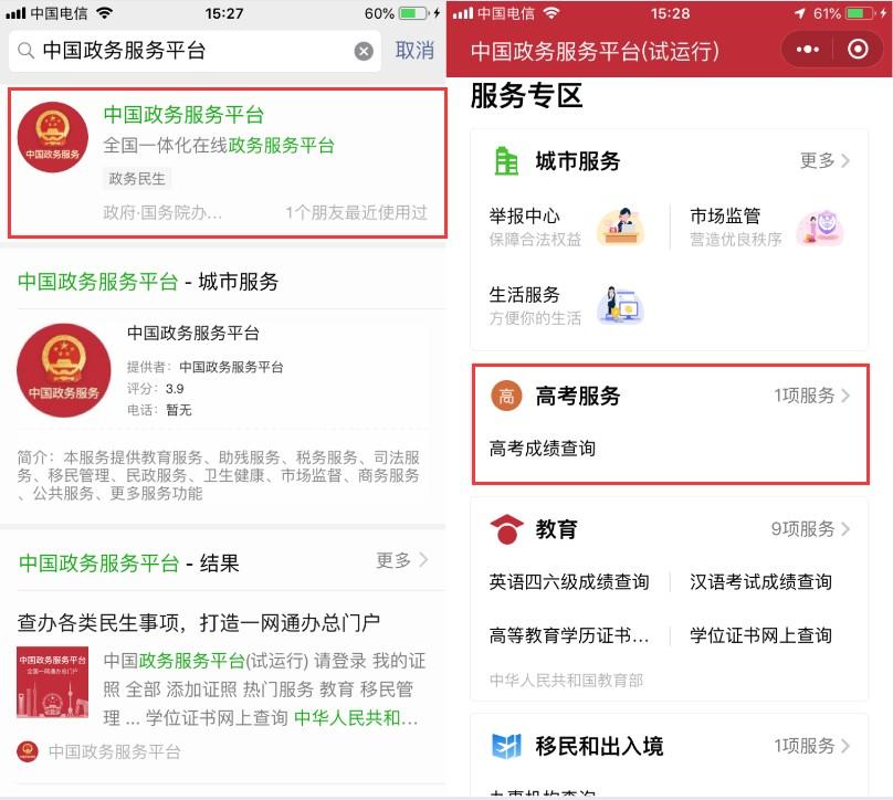 微信查询的方法也是一样的,搜索"中国政务服务平台"这个小程序,在服务专区找到"高考成绩查询"即可。