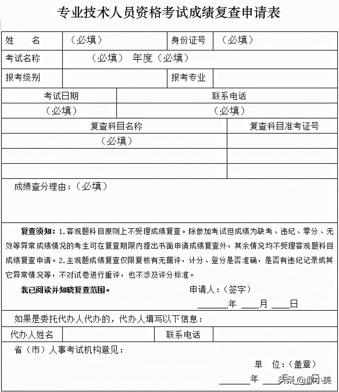 凡参加陕西省二级建造师专业技术人员资格考试的考生,如对公布的本人考试成绩确有疑问时,均可提出成绩核查申请,陕西省住建厅综合服务中心将按规定组织成绩复核和公布复核结果。1.客观题科目原则上不受理成绩复核。对参加考试但成绩为缺考、违纪、零分、无效等异常成绩情况的,可提出复核申请,除上述情形外,不受理成绩核查申请。2.主观题成绩复查仅复核有无漏评,计分是否准确,是否有违纪记录或其它异常情况等,不对试卷进行重评。3.如对考试成绩有异议,考生在成绩公布后30日内向陕西省住建厅综合服务中心提交书面复查申请(成绩复核申请表模板附后,统一打印为A4尺寸)。