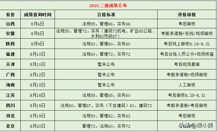 2021年二级建造师考试成绩已于8月开始陆续公布,到目前为止,已有11地(山西、安徽、陕西、天津、福建、广西、海南、江苏、四川、河北、北京)开通了二建成绩查询入口,8地公布二建合格标准。