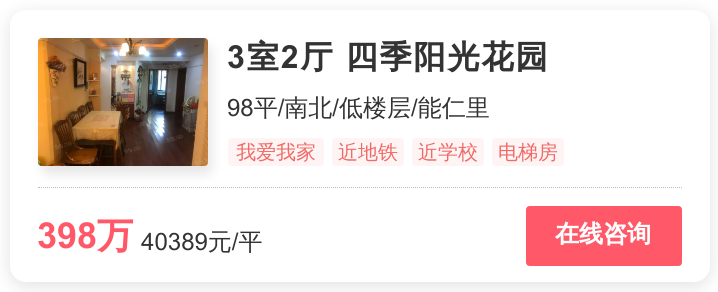 幸福里为你在雨花台找到了位于齐修南苑、花雨南庭、能仁里16号、四季阳光花园、蓝筹谷的5套非常抢手的省重点附近房源。以下将详细介绍这套位于齐修南苑,总价为82万的2居室。从小区层面上看,齐修南苑位于岱山。计算到2020年6月,小区每平参考均价为18410元,低于同商圈均价2597元(岱山商圈的最新参考均价为21007元/㎡),低于同行政区均价9253元(雨花台的最新参考均价为27663元/㎡)。从这套房源本身的卖点来看,该房源邻近省重点名校;推荐这套房还有一个原因,那就是,这套2居室绝不是“老破小”,相反,它的楼龄新,外观状况好。难怪,这套房最近这么受南京购房者关注。此外,该房源为紧凑小两居,布局合理,首套置业优选。朝南,全天采光良好。有电梯,方便快捷,居住环境佳。点击以下房源卡片,即可查看房源照片及更多信息。