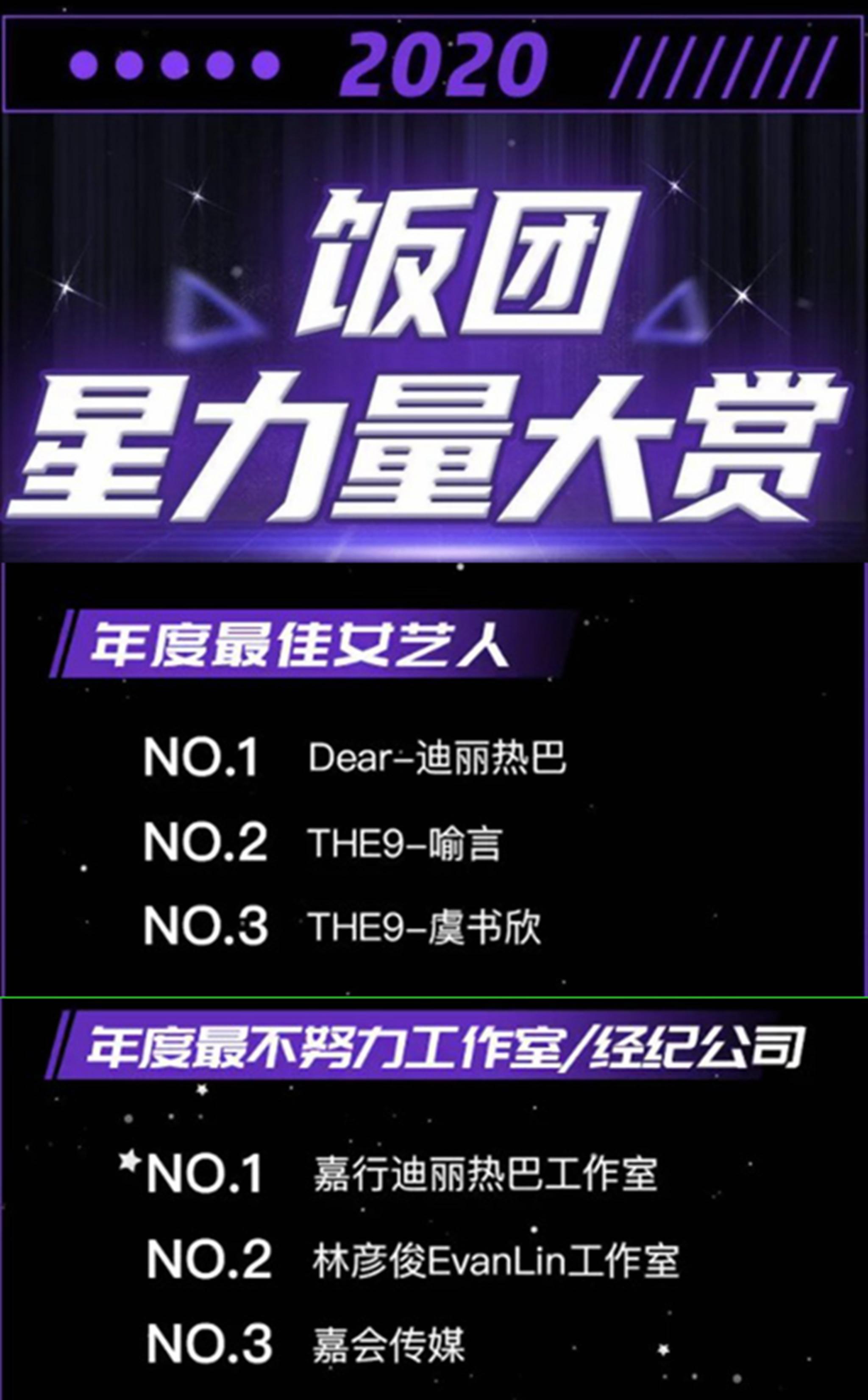 在2021年年初由某饭团APP举行的“2020饭团星力量大赏”评选中,热巴首次荣登“年度最佳女艺人”榜首,而她的工作室竟然被评为“年度最不努力工作室”。
