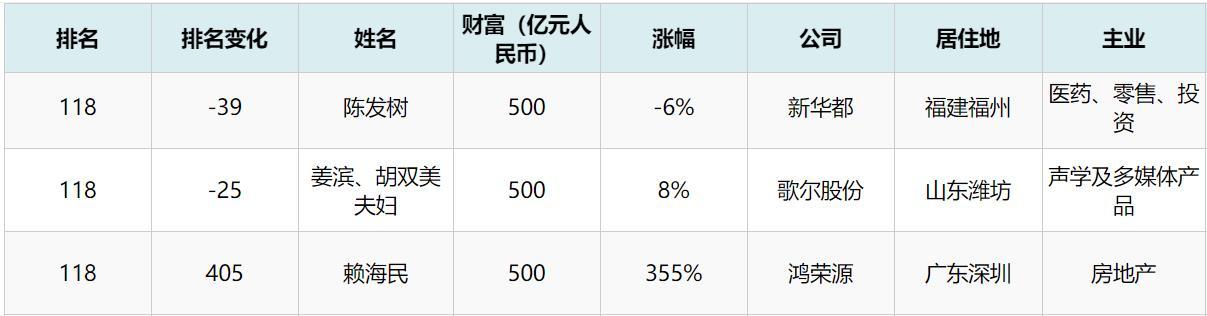 在前不久发布的2021年胡润百富榜上,一位名叫赖海民的深圳地产大佬,以500亿身家的成绩,与新华都的陈发树、歌尔股份的姜滨夫妇等人,共同位列榜单第118位。不过,相比于其500亿的身家,一年355%的巨大涨幅,似乎更能引起大家的注意。