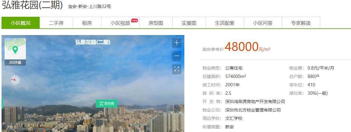 我们在国内某知名二手房交易平台上,找到了这个小区。实际上,弘雅花园共有五期,只不过名称不同,包括雅豪轩(深圳第一批花园式小区)、雅兰亭、雅景居等,而这些建成至今已超过20年的小区,如今价格高达5万元/平米左右,一套房子动辄可达数百万元。
