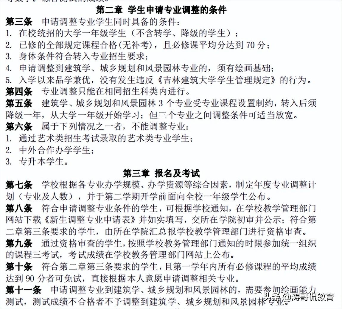 我们可以看到,吉林建筑大学的转专业政策并不苛刻(不想别的院校转专业要求全年级前百分之十),这也给我们提供了一个思路:实在考不上土木类专业,我们可以曲线救国,通过转专业的方式,达成心愿,这也能够督促学生继续努力,上了大学,不要放松。