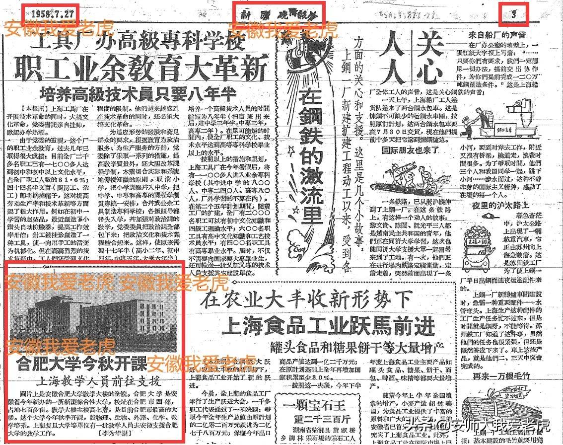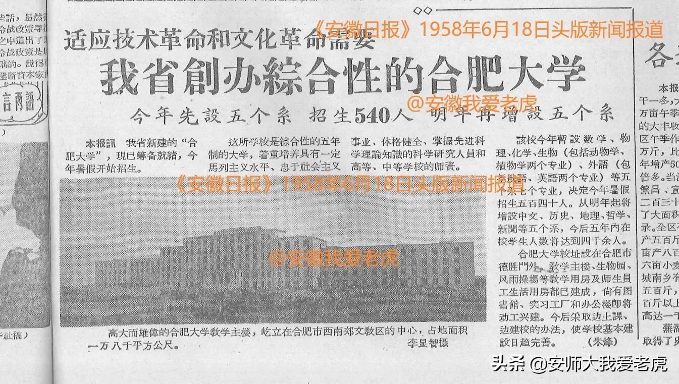 为了继续筹建“合肥大学”,省委统筹复旦大学和华东师范大学等校援建。两校抽调大量师资力量和图书实验器材(详见1958年7月27日《新民晚报》第3版新闻报道《合肥大学今秋开课 上海教学人员前往支援》,报载:……合肥大学是安徽省今年新办的一所新型综合性大学,校址在合肥市西郊,占地七百多亩……),合肥大学才得以筹建成功(详见1958年6月18日《安徽日报》头版新闻报道《适应技术革命和文化革命需要 我省创办综合性的合肥大学 今年先设五个系 招生540人 明年再增设五个系》),并于1958年6月以“合肥大学”校名开始招收本科生(详见1958年6月25日《安徽日报》第四版《安徽省高等学校1958年联合招生简章》)。