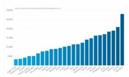 众所周知,上海国际学校的学费不仅是中国最贵,更是全球最贵。《爱尔兰时报》就曾对世界上25个高消费城市做过统计,结果表明上海的国际学校学费确是全球最高:平均每月的学费是2553欧元,相当于2万元人民币,比第二名要高出四分之一还多。