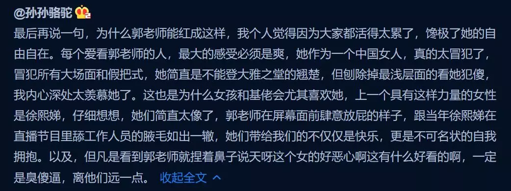 在这样的网络环境里,人们习惯性地忘记“真实”其实本来就是不精致、不得体、不一定好看的。郭老师的“出位”因此显得冲击力十足,她就是一个很普通的女人,不好看也不“高级”,但她不需要解释她自己,因为她是真的。