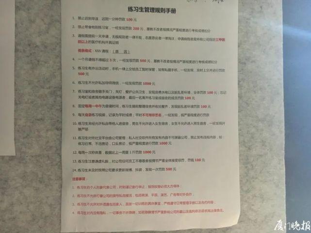 她说,在公司的《练习生管理规则手册》中,有12条涉及罚款。罚款1000元的事项包括:私加导师微信、私人社交软件发布内容屏蔽公司、发布违规内容、体重数据比上周重1斤。“我没被罚过款,但因为擅自跑回宿舍拿衣服被罚在地上滚100圈。”小婷说。