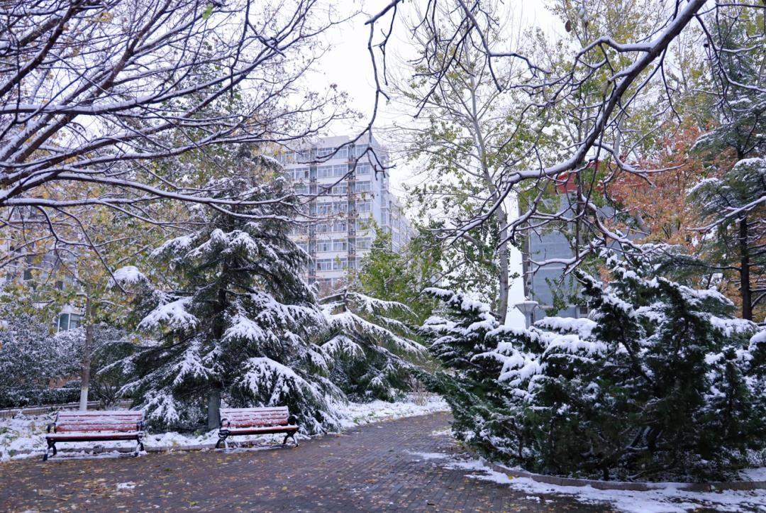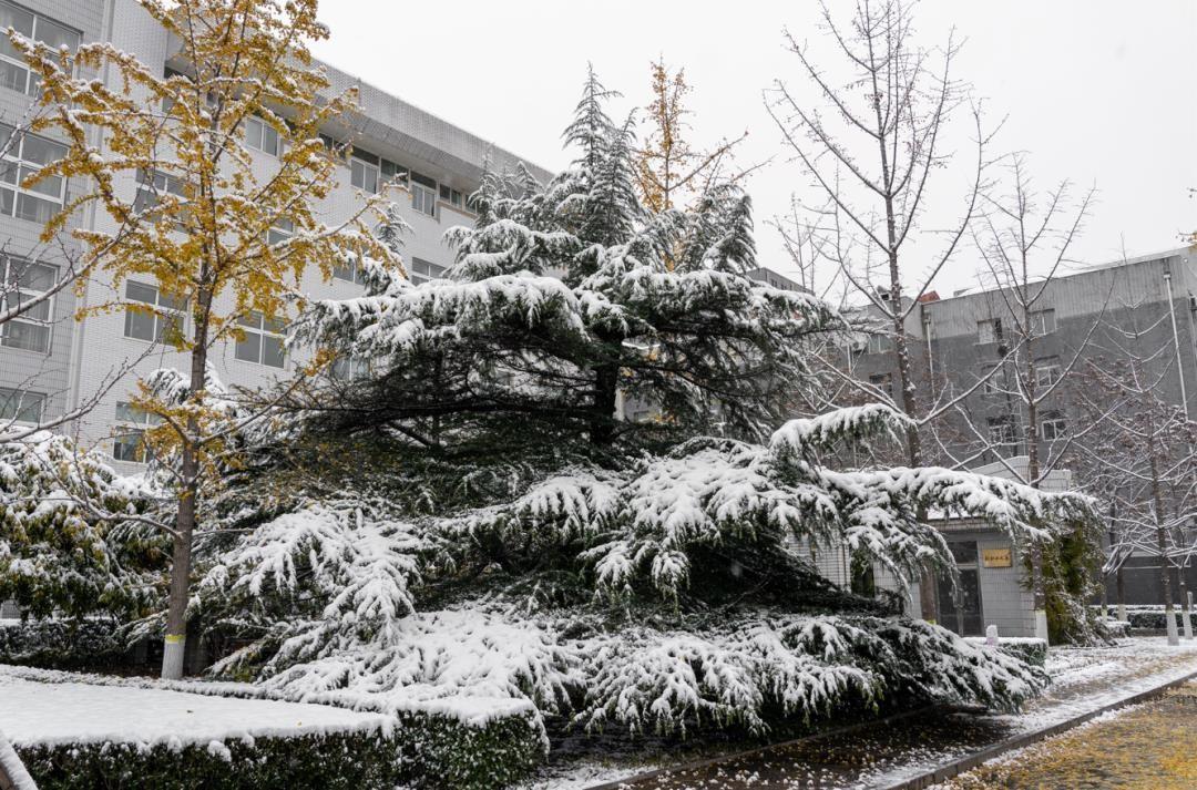 冷清的冬日,薄雾氤氲,连树木稀疏的枝杈也沉默着。可一旦遇到了雪,校园内的一切都变得柔软了起来。一朵朵雪花飘飘然地落了,把建筑、松柏与行人融在一起,给寂静雪白的世界平添了几分烟火气。