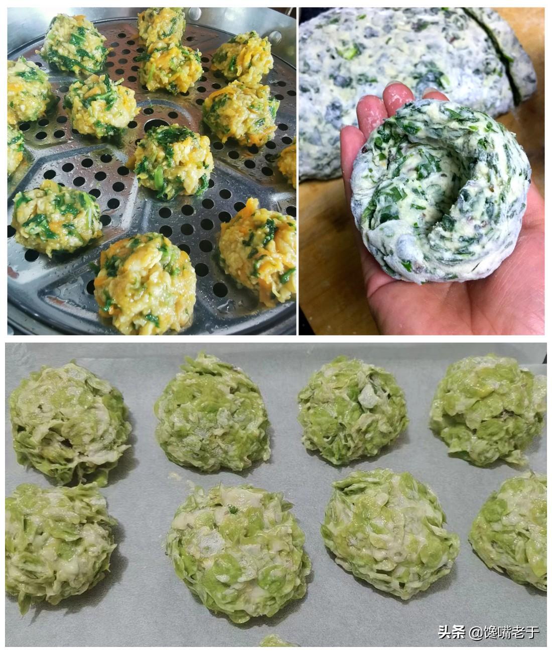 另外,我们还可以用玉米面,或者是白面粉,混合着各种青菜,做成菜团子。这样主食甚至都可以单独成菜,调点酱汁蘸着吃,营养又美味,不需要再做其他菜了。