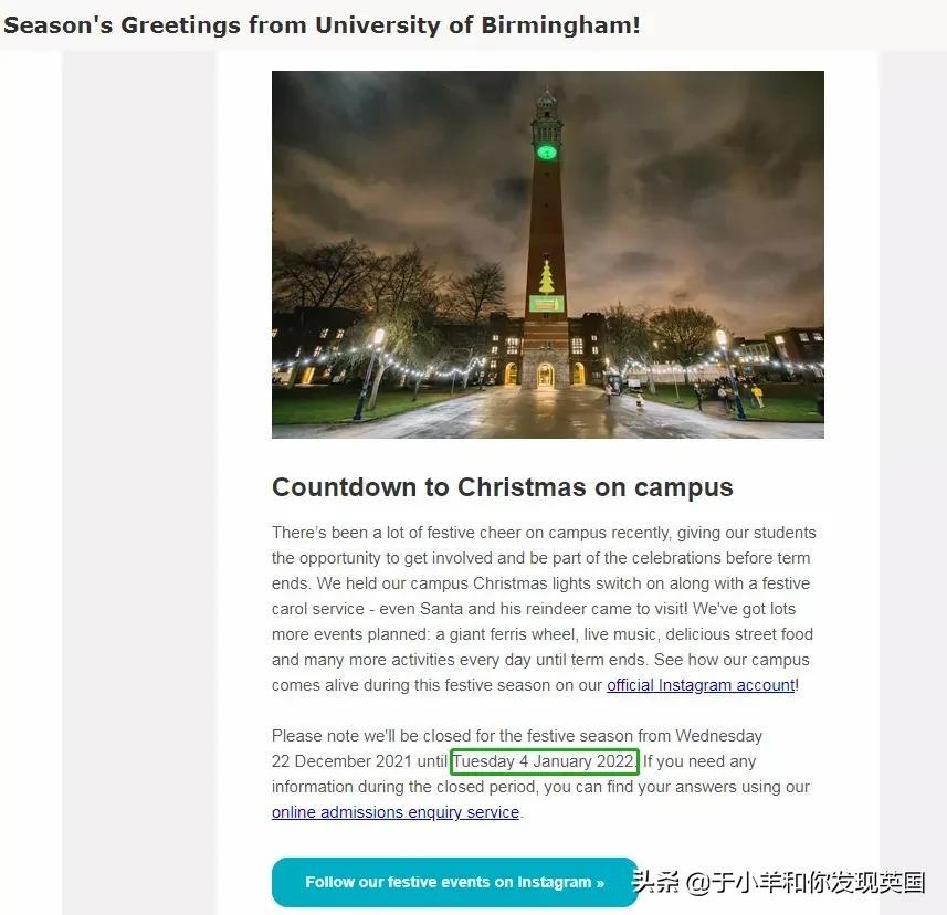 2021年圣诞节要来咯~英国大学已经/即将放假,提醒大家:这期间暂停审理材料,并且有些英国院校申请系统也要关掉!各个英国院校圣诞假期长度不尽相同,有些放假时间长达40天,也有些比较短只有21天,大多数英国大学圣诞假期时间一般在21-28天~