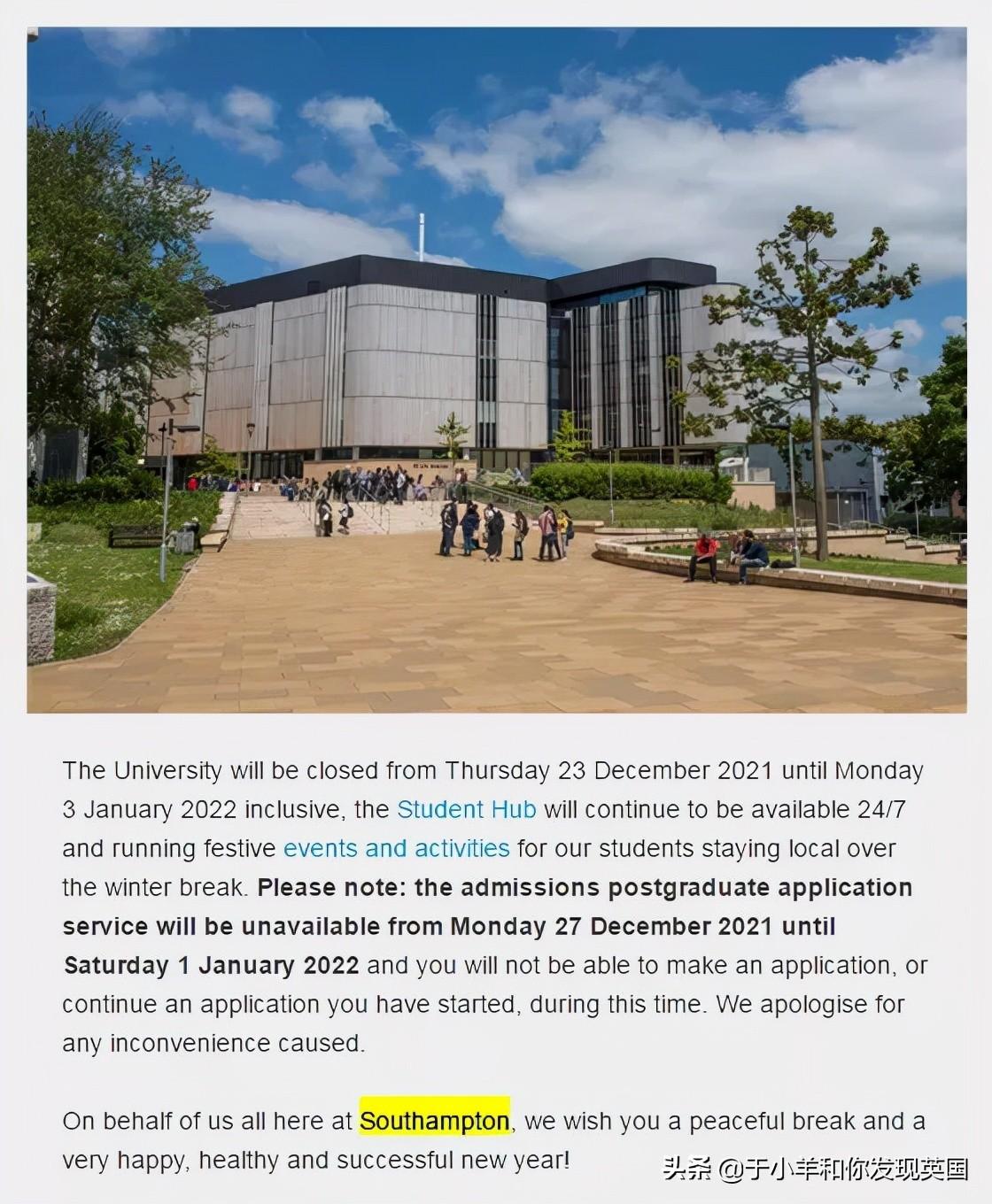 University of Southampton 南安普顿大学:2021年12月23日至2022年1月3日并且,2021年12月27日-2022年1月1日期间研究生申请系统不可用 。