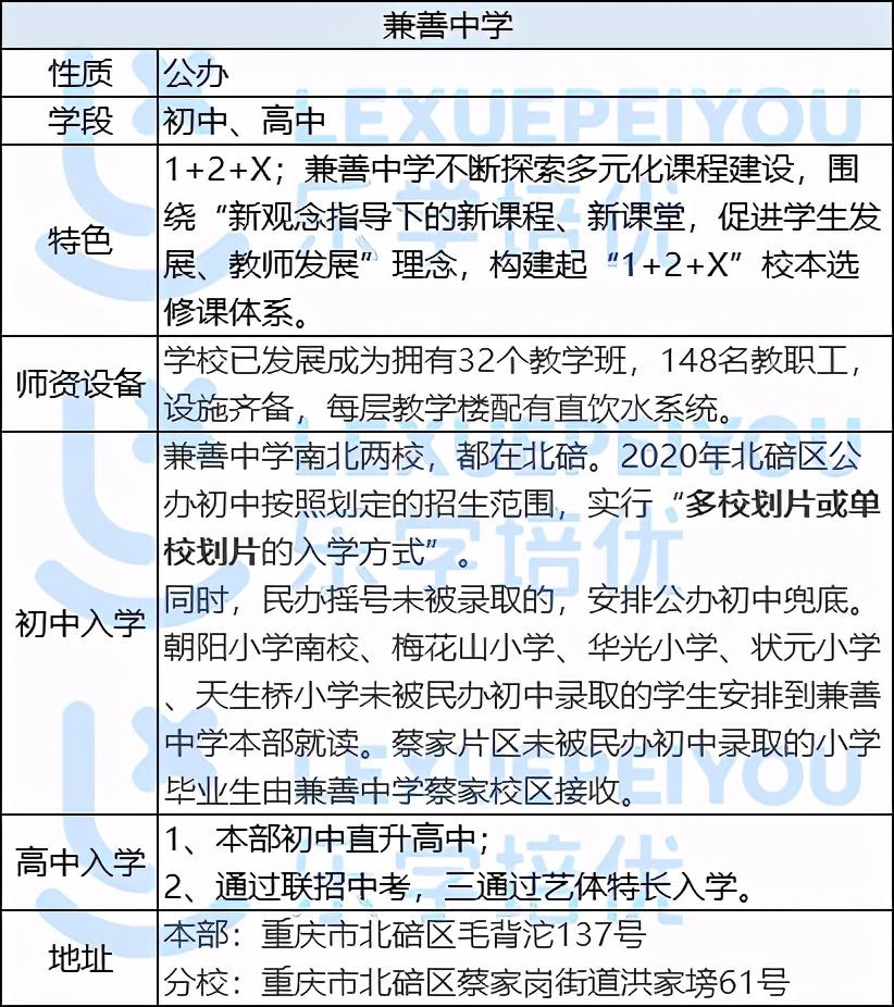建校于1930年的兼善中学,是由中国近代著名爱国实业家、教育家和社会活动家卢作孚先生创办,是原四川省重点中学,重庆市直辖后首批重点中学。现在学校本部占地面积100.5亩,蔡家校区占地230余亩。