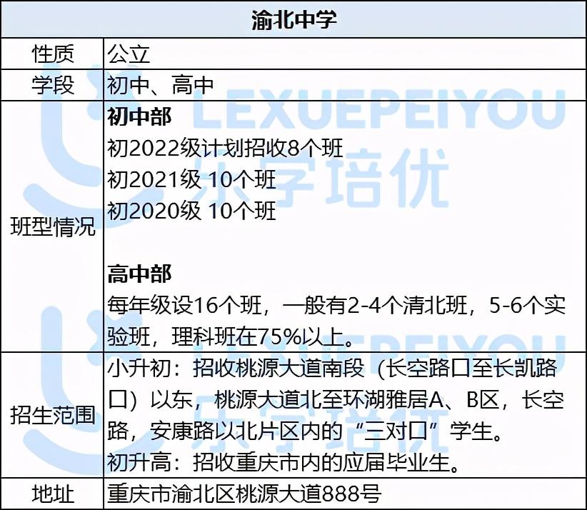 创建于1946年的渝北中学,是由原先的江二中(后又称江北县中)演变而来,学校位于全国卫生城市渝北区府地带,学风浓厚,校规严谨,管理严格,交通便利。该校为渝北区的重点高中,是渝北区最好的重点中学(今年八中整体入驻渝北,对于渝北中学来说,可能会被分走部分优质生源。)。