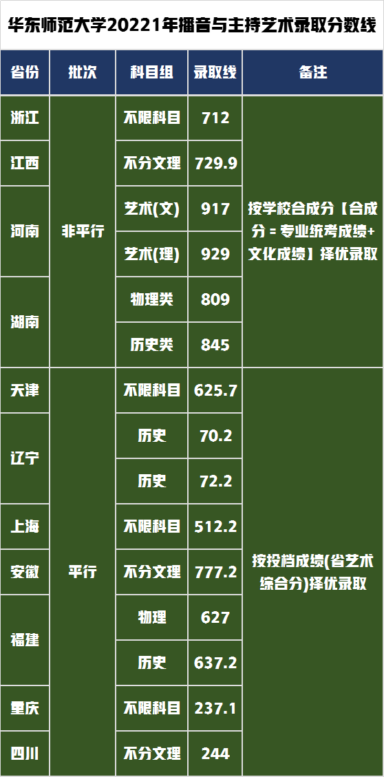 从华东师范大学艺术类录取分数线来分析,招生省份录取成绩非常高,如果统考成绩较高的话有很大的优势,但对文化成绩的要求各省在录取批次上都会有一定的控制,一般都不会低于本省一批线的70%,报考难度较大。