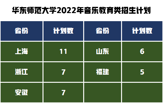音乐学专业招收音教方向的本科生,2022年面上海、山东、浙江等5省音乐教育方向的艺考生36人,具体招生省份计划见下表: