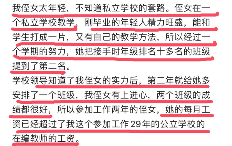 于是在第二年工作中,校领导有分配给年轻教师一个班级,在这位老师的带领下,这两个班级的成绩都在稳步提升,由于工作能力较强,这位老师的工资已经超过的很多在编教师,优厚的工资也让年轻教师弃考教师编制。