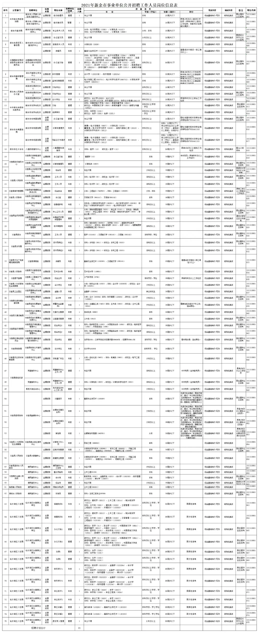 1、招聘单位、岗位、人数及资格条件(含报名职位代码)详见《2021年新余市事业单位公开招聘工作人员岗位信息表》(见附件1)。