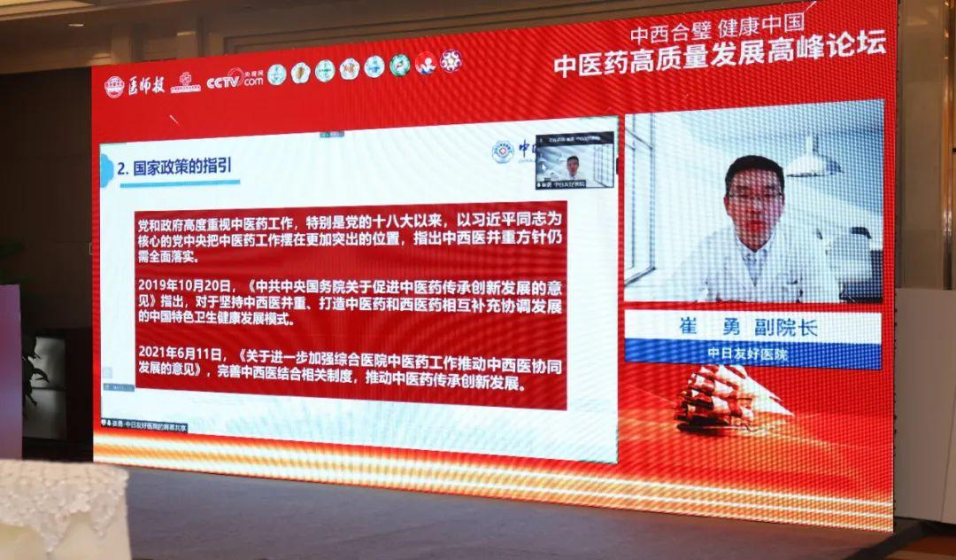 中日友好医院崔勇副院长介绍了《综合医院的中西医结合工作》。中日友好医院作为卫健委直属医院,建院之处的一个初心使命就是“中西医结合的示范”,具备独特的学科设置,一直是我国在综合医院开展中西医结合的“真实世界”,中西医结合也早已纳入医院重点发展的“四大学科群”。近年来医院在中西医结合方面开展很多工作,如开展中西医联合门诊、联合查房,在全院推广优势病种中西医结合诊疗方案,分批建立优势病种质控体系,开展新药转化工作等,同时在实践中也逐步建立起一套促进中西医人才成长与融合机制,并积极探索“西学中”和“中西互学”模式。在学术传承体系方面,已经建立一套完整机制,如构建名老中医传承工作体系、出版名老中医学术思想丛书等。“中日友好医院具备在综合医院开展中西医结合的初心和能力,我们希望用自己38年的实践经验来为更多的医院提供可以复制的模式和可参考的实践经验。