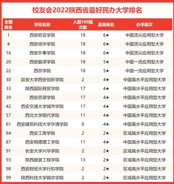 在陕西省民办大学排名中,西安欧亚学院、西安培华学院、西安外事学院居榜单前3名,是陕西省最好的民办大学。