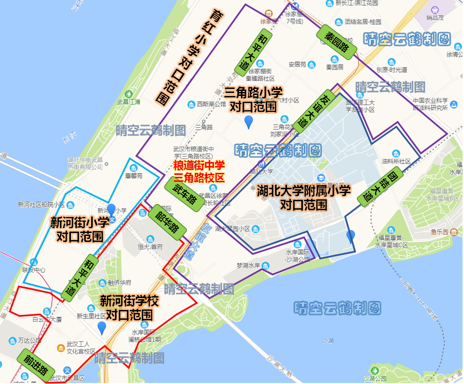3、三角路小学的对口范围(注:待武昌滨江小学建成后,对口范围有可能会重新调整):整体上可以分三个部分,(1)和平大道与友谊大道之间的部分,位于秦园路以南、武车路以北的区域;(2)友谊大道以东的部分,秦园路以南、武车路以北、团结大道——沙湖以西,包括水岸国际沙湖公馆、梦湖水岸等;(3)和平大道以西的部分,当前主要包括武汉绿地国际金融城等小区,武昌滨江小学建成后,应该会有一定的变动。
