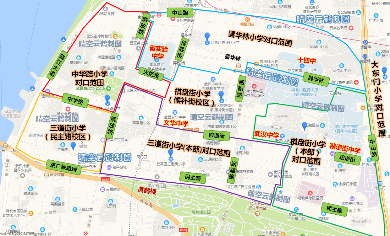 本文是武汉学区系列第45篇。前两篇晴空云鹤对武昌区八大优质义务教育学区中的中南中北路学区、水果湖学区、梅苑学区、百瑞景、南湖、白沙洲等学区各小学的对口划片范围制作了示意地图,本文晴空云鹤将继续对粮道街积玉桥、徐家棚杨园学区的小学新生入学(幼升小)对口划片招生范围制作地图。