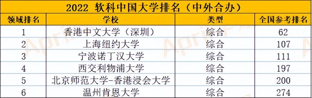 列入中外合办排名榜单的大学有6所,相比去年,排在前三的仍然是港中深、上海纽约和宁波诺丁汉,不过其中这六所学校整体排名都有很大的倒退。