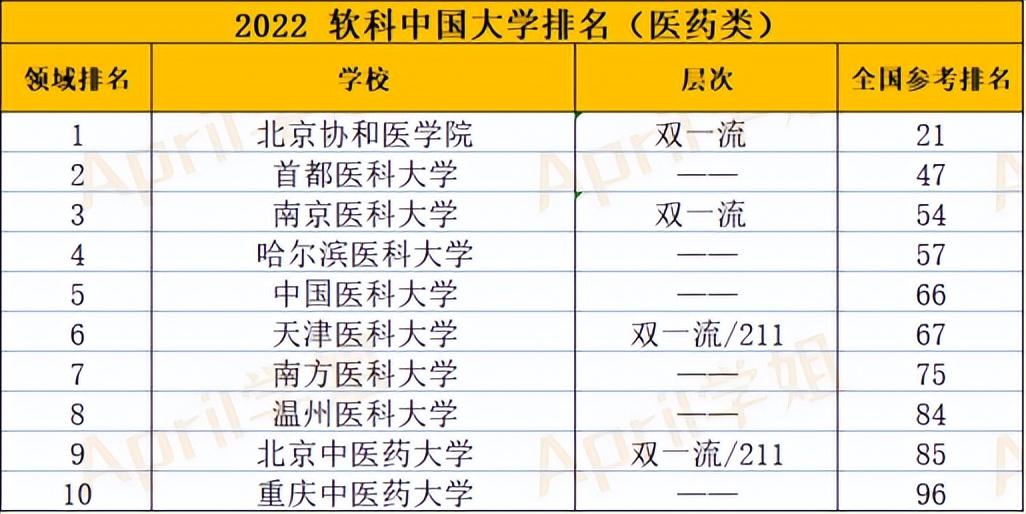 单科大学榜单中,医药类上榜高校有85所,财经类上榜高校有55所,语言类上榜高校有16所,政法类上榜高校有33所,民族类上榜高校有12所,体育类上榜高校有14所。