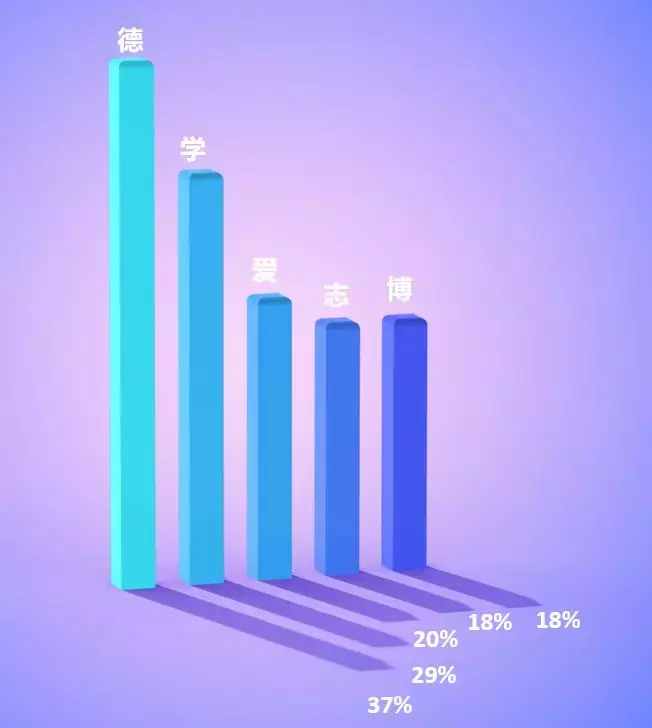 在所有校训中,“德”和“学”的出现频率都是22%。“德”字出现频率如此之高,一方面与学校强调德育的重要性有关,另一方面则与各学校校训喜欢从四书五经里寻章摘句有关。