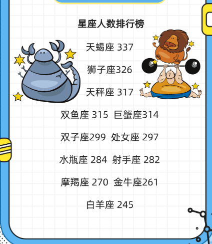 从排名可以看出,2020届新绿们星座为天蝎座的人数最多,高达337人,排名第二和第三的分别是狮子座和天秤座,人数分别在326人和317人。听说星座相配的人性格更合适哦!