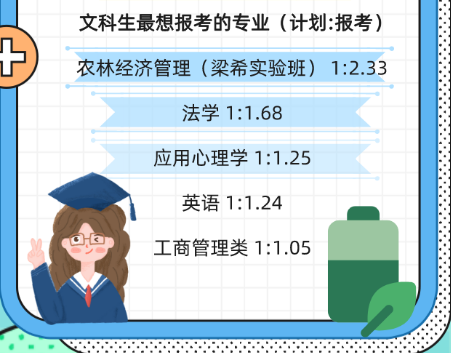 从数据可以看出理科生最想报考排名前五的专业分别是风景园林、金融学、计算机类、数学与应用数学及应用心理学。文科生最想报考排名前五的专业分别是农林经济管理(梁希实验班)、法学、应用心理学、英语和工商管理类。