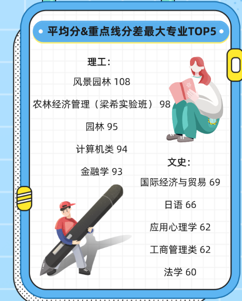 今年平均分&重点线分差最大的理工类专业分别是风景园林、农林经济管理(梁希实验班)、园林、计算机类及金融学;平均分&重点线分差最大的文史类专业分别是国际经济与贸易、日语、应用心理学、工商管理类和法学。