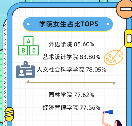 男女比例是新生们十分关心的话题,从整体来看,在北林3395位本科新生中,男女比例接近1:2,其中女生人数实际占比64.68%。女生占比最高的五所学院分别是外语学院、艺术设计学院、人文社会科学学院、园林学院和经济管理学院。男生占比最高的五所学院分别是工学院、信息学院、理学院、水土保持学院以及林学院。那些想在大学校园里实现脱单理想的新绿们,现在应该心里有谱了吧!