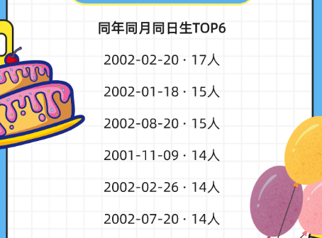 从出生年份看,2002年出生的萌新为主力军,2002年2月20日这一天出生的人数高达17人,13位同学与祖国同天庆生,9位同学与北林同一天吃蛋糕,40位同学将在报到期间迎接新一岁的自己,最小的新绿才刚刚过完15岁生日,来自重庆市的双胞胎也等待大家慧眼识双姝。