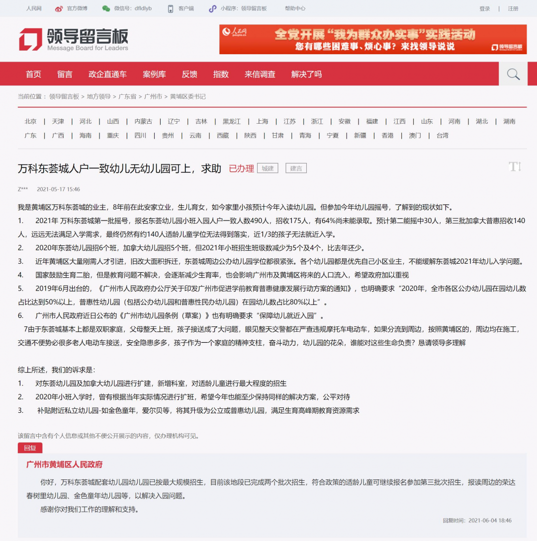 广州黄埔万科东荟城业主对幼儿园学位扩建的诉求,政府回复了!