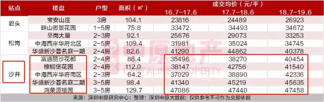 近三年,11号线通车后,沿线楼盘价格都有了不同的涨幅,沙井作为沿线利好区域,以富通丽沙花都为例,成交均价从2016年的35496元上涨到目前的40454元,上涨幅度约14%。